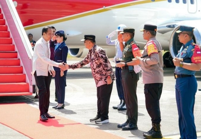 Kedatangan Presiden Jokowi disambut oleh Penjabat Gubernur Kalimantan Timur (Kaltim) Akmal Malik, Pangdam VI Mulawarman Mayjen TNI Tri Budi Utomo, Kapolda Kaltim Irjen Pol Nanang Avianto, Danlanud, dan Danlanal.